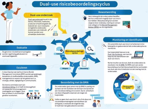 Deze infographic geeft een helder overzicht van de verschillende fasen binnen de dual-use risicobeoordelingscyclus. Op de achterkant staat een set gerichte vragen die door de BMA kunnen worden gebruikt tijdens gesprekken met onderzoekers. Beschikbaar in het Engels en Nederlands.